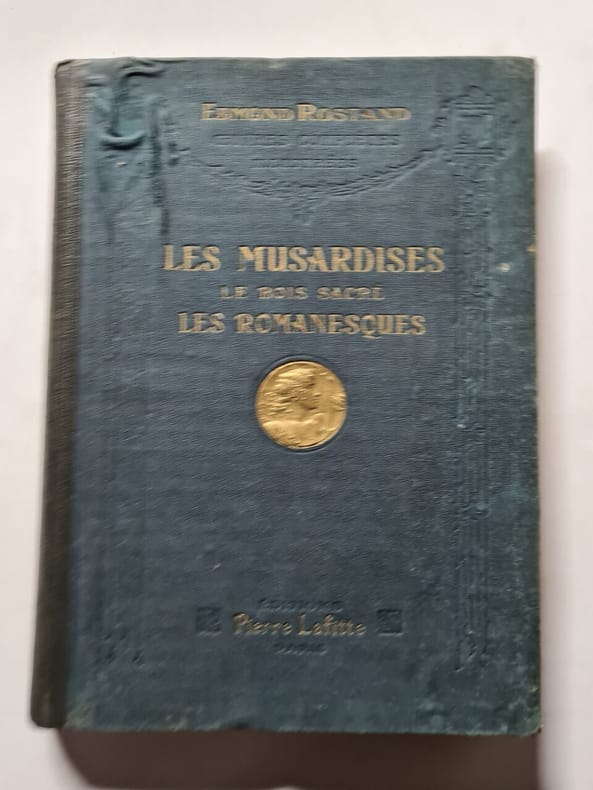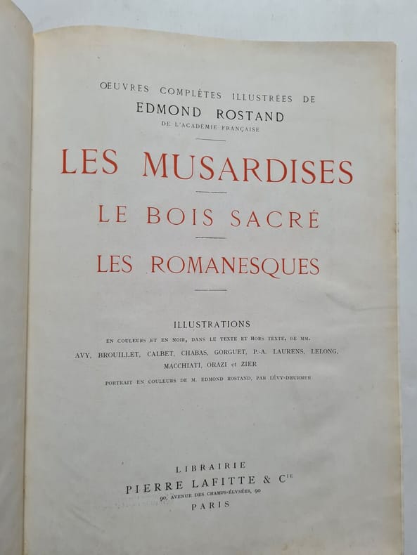 Librairie Pierre Lafitte et Cie, coll. « Oeuvres complètes illustrées de Edmond Rostand » 1911 In-4 reliure éditeur demi chagrin vert. Dos lisse avec titre et décor floral, premier plat avec titre et médaillon central contrecollé dorés. Frontispice par R. Lelong “la chambre d’étudiant” accompagné d’une citation “C’est là qu’ils tomberont, autour du pied de cuivre, tous ces rêves en rond ! ”30 cm sur 22. XIX-191 +XVI+99 pages. Illustrations en couleurs et en noir et blanc in et hors-texte. Bon état d’occasion.