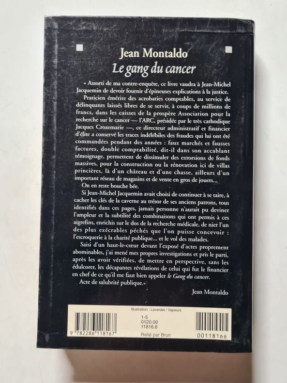 Albin michel 1996 284 pages in8. 1996. broché. 284 pages. assorti de ma contre-enquete ce livre vaudra a jean-michel jacquemin de devoir fournir d'epineuses explications a la justice. praticien emerite des acrobaties comptables au service de delinquants laisses libres de se servir a coups de millions de francs dans les caisses de la prospere association pour la recherche sur le cancer -l'arc presidee par le tres cathodique jacques crozemarie - ce directeur administratif et financier d'elite a conserve les traces indelebiles des fraudes qui lui ont ete commandees pendant des annees : faux marches et fausses factures double comptabilite dit-il dans son accablant temoignage permettent de dissimuler des extorsions de fonds massives pour la construction ou la renovation ici de villas princieres la d'un chateau et d'une chasse ailleurs d'un important reseau de magasins et de vente en gros de jouets.on en reste bouche bee. si jean-michel jacquemin avait choisi de continuer a se taire a cacher les cles de la caverne au tresor de ses anciens patrons tous identifies dans ces pages jamais personne n'aurait pu deviner l'ampleur et la subtilite des combinaisons qui ont permis a ces aigrefins enrichis sur le dos de la recherche medicale de nier l'un des plus execrables peches que l'on puisse concevoir : l'escroquerie a la charite publique. et le vol des malades. saisi d'un haut-le-c?ur devant l'expose d'actes proprement abominables j'ai mene mes propres investigations et repris le parti apres les avoir verifiees de remettre en perspective sans les edulcorer les decapantes revelations de celui qui fut le financier en chef de ce qu'il me faut bien appeler le " gang du cancer ". acte de salubrite publique
