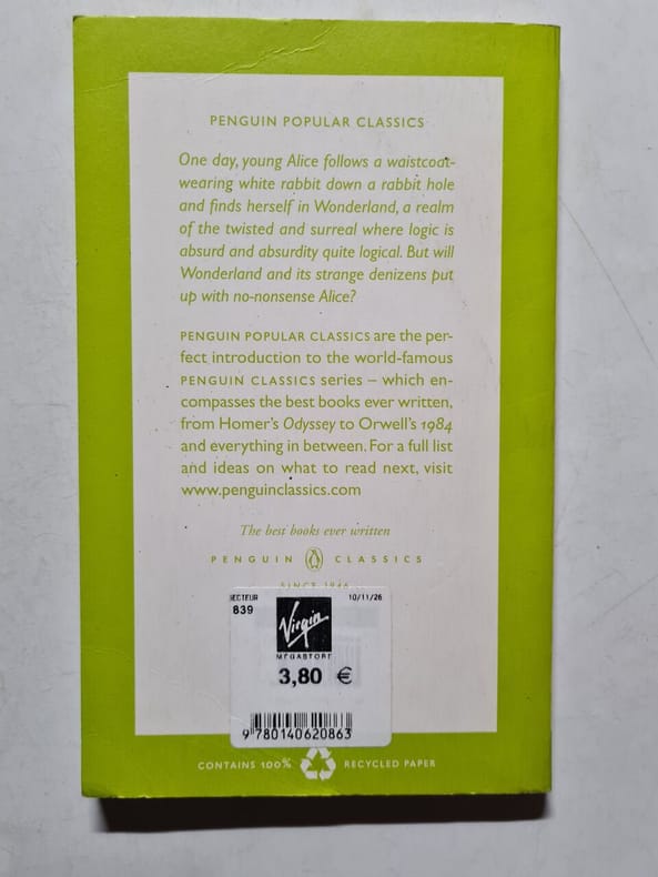 Cahier de 24 planches hors-texte de dessins tirés de l'édition anglaise, en noir et blanc (complet) 1ere édition dans cette collection bilingue en poche, 1970 Contents, Chapitres : Chronologie, préface et bibliographie - Texte anglais avec sa traduction française en juxtalinéaire - Les Aventures d'Alice au pays des merveilles (titre original : Alice's Adventures in Wonderland), fréquemment abrégé en Alice au pays des merveilles, est un roman écrit en 1865 par Lewis Carroll, nom de plume de Charles Lutwidge Dodgson. Le livre a été traduit en français pour la première fois en 1869 par la même maison d'édition (Macmillan and Co). À l'origine, lors de sa première écriture, le livre n'était pas destiné aux enfants. L'écriture fut reprise une seconde fois pour les enfants en conservant les personnages merveilleux qui la rendaient si attrayante pour ce jeune public. Le roman foisonne d'allusions satiriques aux amis de l'écrivain et aux leçons que les écoliers britanniques devaient mémoriser à l'époque. Le pays des merveilles, tel qu'il est décrit dans le conte, joue sans cesse avec la logique. Le livre a connu une suite intitulée De l'autre côté du miroir. Les adaptations cinématographiques combinent souvent des éléments des deux livres. De nos jours, l'ouvrage reste populaire aussi bien auprès des enfants que des adultes. L'écrivain américain Martin Gardner a publié The Annotated Alice (non traduit en français) qui regroupe Alice au pays des merveilles et De l'autre côté du miroir accompagnés des poèmes victoriens que Lewis Carroll parodia dans le corps du texte. (source : Wikipedia) couverture un peu jaunie, avec une infime trace de pliure au coin inférieur du plat supérieur, sinon bon état, intérieur frais et propre mais avec 2 signatures et une date sur la première page, texte propre, bien complet des 24 planches reproduisant les dessins originaux en noir - format de poche
