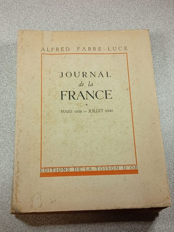 Le premier tome du journal, qui en compte quatre, tenu par Fabre-Luce pendant toute la durée de la guerre. Largement diffusé et lu l'année de parution en 1940, ce livre a été interdit en 1945 pour son caractère ˮcollaborationisteˮ. A noter que le chapitre ˮhitlérisme françaisˮ à été supprimé des éditions d'après-guerre. Esprit curieux et indépendant, l'auteur traduit bien dans son journal les tentances du temps sans d'ailleurs prendre position. C'est donc un document intéressant pour bien saisir la mentalité des Français au début de l'Occupation après le choc de la défaite et l'espoir de l'armistice.