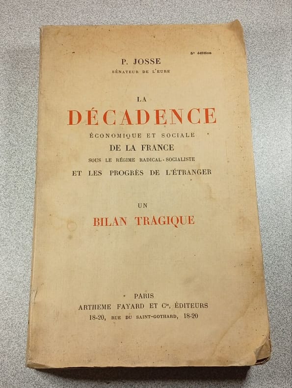 Arthème Fayard et Cie Éditeurs 1919 in8. 1919. Broché. Ouvrage de Prosper Josse publié en 1928 qui dresse un bilan critique et alarmiste de la situation économique et sociale de la France sous le régime radical-socialiste en la comparant défavorablement aux progrès réalisés par les autres nations