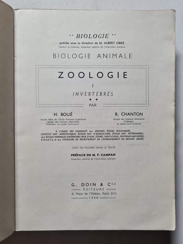 Préface de M.F. Campan. A l'usage des candidats aux grandes écoles biologiques, aux écoles suppérieures et aux concours de recrutement. Biologie publiée sous la direction de M. Albert Obré. Biologie animale. Classification Dewey : 590-Zoologie