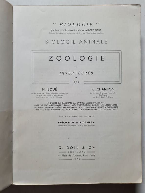 Quelques menus défauts, sinon bel état de conservation. En 1911, lorsque Jean Montaudon (1886-1926), petit-neveu du Docteur Auzoux, prend la direction de la célèbre fabrique de modèles d’anatomie clastique en papier mâché et souhaite en diversifier le catalogue, il se lance dans la production d’affiches pédagogiques illustrées. Mais la concurrence féroce des maisons Deyrolle, Hachette et Cie, Masson ou encore Armand Colin, plus anciennement établies dans ce secteur-clé de l’édition scolaire, le contraint à adopter une stratégie commerciale audacieuse et originale : la publication de planches murales « de luxe », d’une haute qualité scientifique et artistique, destinées principalement aux étudiants des universités ou des écoles normales. Aussi confie-t-il l’impression à l’un des plus importants réalisateurs d’affiches et objets publicitaires de la Belle Epoque, dont le nom reste notamment associé à Mucha, Sarah Bernhardt et Lefèvre-Utile : Ferdinand Champenois. Pour la typographie, le caractère Auriol, fleuron de l’Art nouveau, pare les titres et sous-titres. L’exécution graphique des planches est l’oeuvre de talentueux dessinateurs, sachant allier finesse et précision du trait avec un sens de la couleur et un souci du détail remarquables. Enfin, pour la conception des tableaux, il s’entoure de spécialistes tels que les zoologues Rémy Perrier (1861-1936) et Casimir Cépède (1882-1954). Le choix de ces représentants de l’excellence académique française s’avéra judicieux pour insuffler aux Etablissements Auzoux le nouvel élan voulu par Montaudon. Ce dernier a probablement été séduit par leur commun attachement à la transmission du savoir : tous deux normaliens, ils mènent en effet des carrières d’enseignants respectés au sein de la Faculté des Sciences de Paris et d’autres institutions. L’étendue des réseaux intellectuels auxquels ils appartiennent a sans doute joué un rôle non négligeable, car tandis que Cépède fréquente les cercles artistiques de Bourdelle et Gémier, puis collabore avec le Docteur Toulouse aux programmes documentaires du service scientifique de la firme cinématographique Pathé, Perrier entretient, par l’intermédiaire de son frère Edmond, directeur du Museum d’Histoire naturelle et président de l’Académie des Sciences, des liens étroits avec l’élite scientifique de son temps. Enfin, ils disposent, au-delà de leurs domaines d’expertise respectifs (malacologie et bactériologie-parasitologie), de compétences et expériences fort appréciables : entre autres, publication d’ouvrages de référence et participation à l’élaboration d’illustrations scolaires (R. Perrier), mise au point de vaccins et création de modèles d’insectes démontables afin de former les équipes soignantes aux protocoles antipaludiques (C. Cépède). L’entrepreneur leur accorde donc de très avantageux contrats (droits d’auteur de 20 %) et carte blanche pour le choix des sujets. Ainsi, à la fin de la Première Guerre mondiale, les deux savants prévoient une « collection » d’environ 150 planches permettant de « donner un cours complet de zoologie », auxquelles doivent s’ajouter des séries sur l’anatomie, la physiologie humaine et la botanique, comme l’indiquent les catalogues. Indéniablement, l’ensemble est une véritable réussite, tant sur le plan formel que sur le fond - à la fois précis, rigoureux, esthétique – atteignant l’objectif de se démarquer des autres éditeurs. Le premier tome d’un Atlas de Zoologie et d’Anatomie contenant la description de 17 affiches paraît également au début des années 1920. Cependant, dès 1922, lorsqu’ils dressent le bilan financier de la fabrique, qui s’avère désastreux, les rapports comptables soulignent la responsabilité majeure des planches dans les difficultés économiques : leur diffusion reste limitée, et à l’évidence bien trop faible pour rentabiliser les investissements. Seulement une trentaine d’entre elles voit le jour pour la zoologie, moins d’une dizaine pour la biologie végétale ; il n’y aura pas d’autre volume de l’Atlas. L’aventure prend fin avant même la mort de Jean Montaudon, en 1923. Sa veuve se résout ensuite (en 1927) à céder l’établissement à Henri Barral qui, ayant également acquis les maisons Tramond et Vasseur (spécialisées dans les cires anatomiques et la réalisation de squelettes à partir de restes de dissection), privilégie d’autres orientations. Il faudra attendre les années 1940 pour que paraissent de nouvelles séries, - dont les fameuses planches schématiques en couleurs sur fond noir, attributs incontournables des salles de classes de l’après-guerre.Relativement rares et méconnues, les affiches pédagogiques de la « collection Rémy Perrier et Casimir Cépède » ont été peu conservées dans les institutions patrimoniales, ou l’ont été de manière lacunaire. Aussi sont-elles aujourd’hui très recherchées par les collectionneurs, amateurs de sciences naturelles ou de cabinets de curiosités. Leur très bel état de conservation ajoute encore à leur caractère tout à fait exceptionnel. ***** ENGLISH TRANSLATION ****** In 1911, Jean Montaudon (1886-1926) (Dr Auzoux's great-nephew) took over the management of the famous factory of "papier-mâché clastic anatomy models" and wanted to diversify the catalog. He launched into producing illustrated educational posters but had to cope with fierce competition from the houses Deyrolle, Hachette and Cie, Masson, and even Armand Colin. All of them were more established in this key sector of educational publishing. This forced him to adopt a daring and original commercial strategy : the publication of " luxury" wall posters of high scientific accuracy and artistic quality, mainly intended for students of universities and Ecoles Normales (training schools for future teachers). Therefore h
