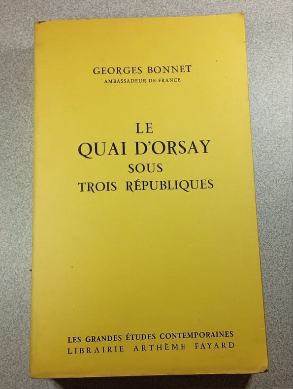 "Quand un historien se double d’un homme d’État, son analyse du passé prend un singulier intérêt. En effet, abordant l’histoire en connaissant les dessous des grandes affaires, les passions, les calculs qui se cachent derrière toute négociation, il peut nous en donner une vue plus nuancée, plus large et plus humaine. A tous ceux qui veulent savoir ce que sont les traités de Versailles, Locarno, Munich, Yalta, Potsdam, etc. il apporte une série de notions claires qui expliquent notre monde contemporain. Tout ce récit est d’une lecture vivante. Rien ne traîne. Le style est clair et alerte, l’ouvrage fortement composé. En 1924, Georges Bonnet entre dans la vie publique ; en 1938, l’Élysée l'appelle pour former le Gouvernement. Deux mois plus tard, Hitler prend l’Autriche. Après ce coup, la panique règne. On l’appelle au Quai d’Orsay. Puis c’est le voyage de George VI ; la crise tchécoslovaque. Enfin Munich et l’accueil délirant de Paris et de la France. Mais le ministre ne cache pas son pessimisme ; la guerre est seulement retardée, il faut réarmer précipitamment. Alors, c’est la tragique année 1939. Hitler entre à Prague, la France négocie avec l’URSS, mais le 23 août, Molotov signe avec Hitler. Georges Bonnet fait réunir le Comité de la Défense Nationale. Le Généralissime répond “L’armée est prête”. Ce sont les dernières journées avant l’invasion de la Pologne. Les lecteurs découvrent ses conversations téléphoniques avec Ciano, les ministres anglais, puis avec l’Ambassadeur qui porte la déclaration de guerre à Hitler. Ensuite, c’est la défaite, l’effort de la France pour la surmonter... (...) C’est toute une longue période de notre passé, replacée au milieu des événements internationaux, que Georges Bonnet a racontée en enrichissant le récit de l’historien de l’expérience de l’homme d’action." (L'Editeur) — "L'étude ne commence réellement qu'en 1919 : il s'agit en fait d'une esquisse d'histoire diplomatique, assortie d'un plaidoyer pro domo que prononce l'ancien ministre des affaires étrangères à propos de Munich. L'auteur ne ménage pas ses accusations contre l'Union soviétique, les Etats-Unis et la Grande-Bretagne, responsables de l'isolement de la France – après comme avant la seconde guerre mondiale." (Revue française de science politique, 1961)