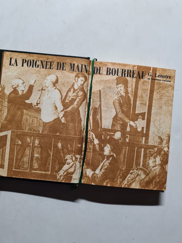 "L’exécuteur des jugements criminels qui supplicia Louis XVI se nommait, comme nul ne l’ignore, Charles Sanson. Cinquantenaire en 1790, il avait alors offert sa démission, sous prétexte de fatigue, mais, en réalité, parce qu’il lui répugnait d’employer la machine à décapiter dont le docteur Guillotin préconisait l’adoption..." — 21 études : La poignée de main du bourreau ; Les fiançailles de Madame Roland ; Madame de Mirabeau ; Le roman d'un bas-bleu ; Un plaidoyer de Robespierre ; Martin Dauch ; Le mariage de Mademoiselle Palloy ; Une ambassade ; Le roman d'un terroriste ; Les désenchantements d'un d'Artagnan prussien ; Lalligand-Morillon ; Précy ; Teufel-Feuer ; Un paria ; Le secret du prince ; Un régicide amoureux ; Un fonctionnaire ; Dupérou ; L'abbé Psaume ; Madame ; Panis.