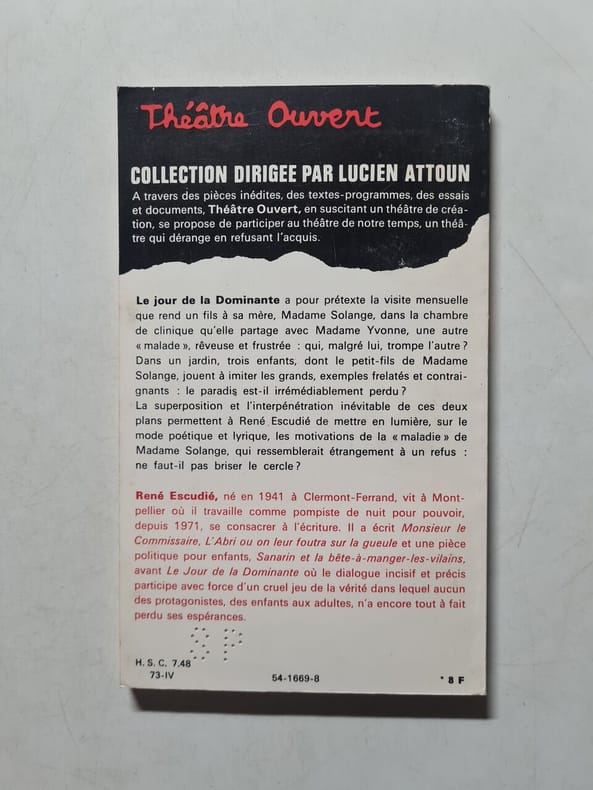Stock, Théâtre ouvert, 1973, 118 p., broché, couverture légèrement défraîchie.
