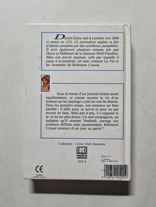 Paris, Librairie de Firmin-Didot & Cie, 1877 ; in-4, XII-394 pp., reliure pleine percaline estampée et illustrée (dos de couverture déchiré) tranches dorées (quelques rousseurs). Daniel De Foe, écrivain et haut fonctionnaire anglais, travaille à l'unification de l'Angleterre et de l'Ecosse, il publie 'les Aventures de Robinson Crusoé' qui racontent la vie pendant 5 ans sur l'ile de Mas a Terra (archipel de Juan Fernandez) inspiré de l'aventure d'Alexandre Selkirk. État moyen.