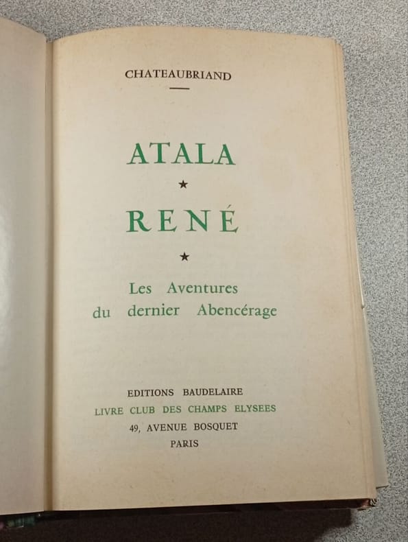 Si Atala et René ont paru respectivement pour la première fois en 1801 et 1805, l'édition originale du Dernier Abencerage (bien qu'écrit en 1806) n'a été publiée qu'en 1826 dans le tome XVI des Oeuvres complètes parues chez Ladvocat (1826-1831). Il paraît à nouveau, ici réuni pour la première fois avec les deux autres textes, en 1827. Les dessins de Devéria, gravés par Laderer, Fontaine et Touzé, sont placés en tête de chaque partie.