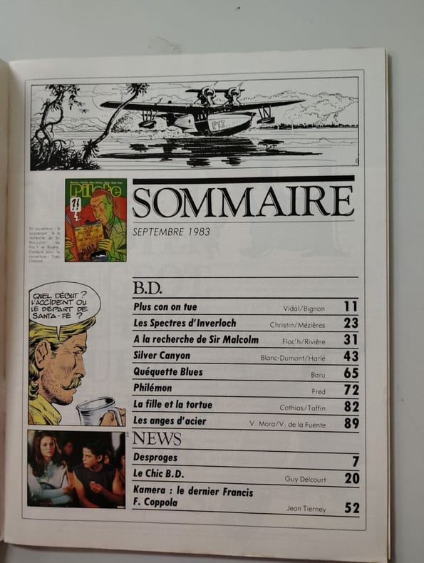 Sommaire : Plus con on tue Vidal/Bignon - les spectres d'Inverloch Christin/Mézières - à la recherche de Sir Malcolm Floc'h/Rivière - Silver Canyon Blanc-Dumont/Harlé - quéquette blues Baru - Philémon Fred - la fille et la tortue Cothias/Taffin - les anges d'acier V.Mora / V.de la fuente - Desproges - le chic b.d. - Kamera le derni Francis F.Coppola Jean Tierney. Classification Dewey : 70.49-Presse illustrée, magazines, revues