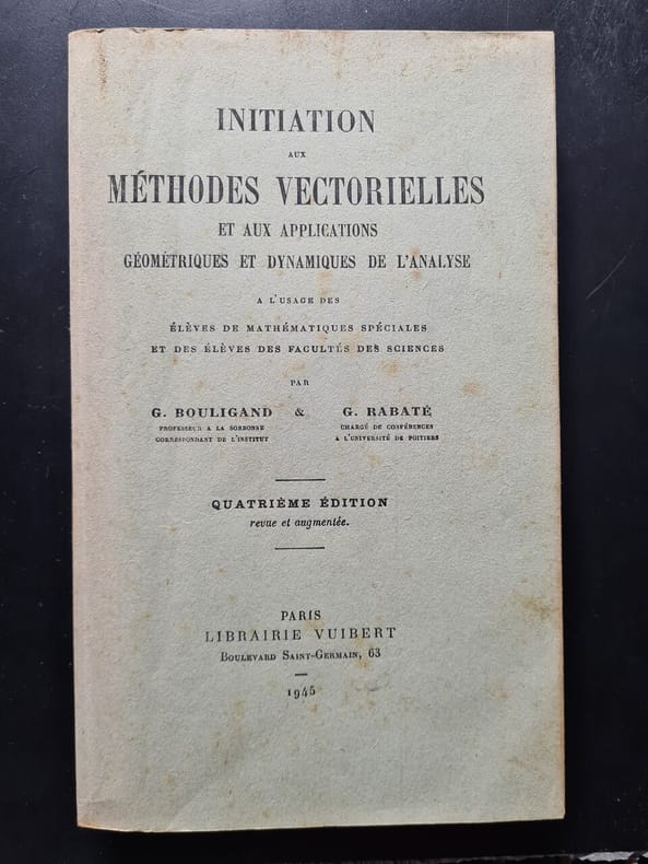 Broché bon état . Contenu propre . Pied de dos fragilisé. Quelques annotations au crayon de bois ne gênant en rien la lecture . 1953.322 pages . INITIATION AUX MÉTHODES VECTORIELLES ET AUX APPLICATIONS GÉOMÉTRIQUES ET DYNAMIQUES DE L'ANALYSE .