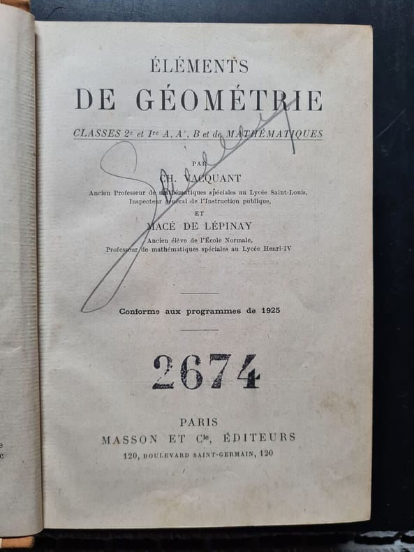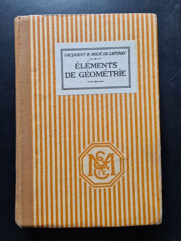 14 planches dépliantes "Dans le domaine de l'éducation, les Éléments de géométrie de Legendre ont dominé l'enseignement de la géométrie élémentaire pendant près d'un siècle. Présentés sous forme axiomatique, en réaction contre les Éléments de géométrie de Clairaut, ils marquent un retour en France à l'axiomatique euclidienne. On y trouve d'intéressantes considérations sur le postulat des parallèles, qui marquent une étape dans l'histoire des géométries non euclidiennes" vol gd in-8, 215x135, relié dos cuir, accrocs, bel état intérieur, quasi sans rousseurs, 430pp Paris Didot 1840 ref/15