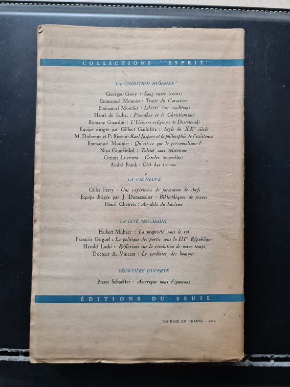Seuil. 1946. In-8. Broché. Etat d'usage, Couv. légèrement passée, Dos plié, Non coupé. 793 pages. Plats passés. Dos fané. Papier jauni.. . . . Classification Dewey : 100-PHILOSOPHIE ET DISCIPLINES CONNEXES