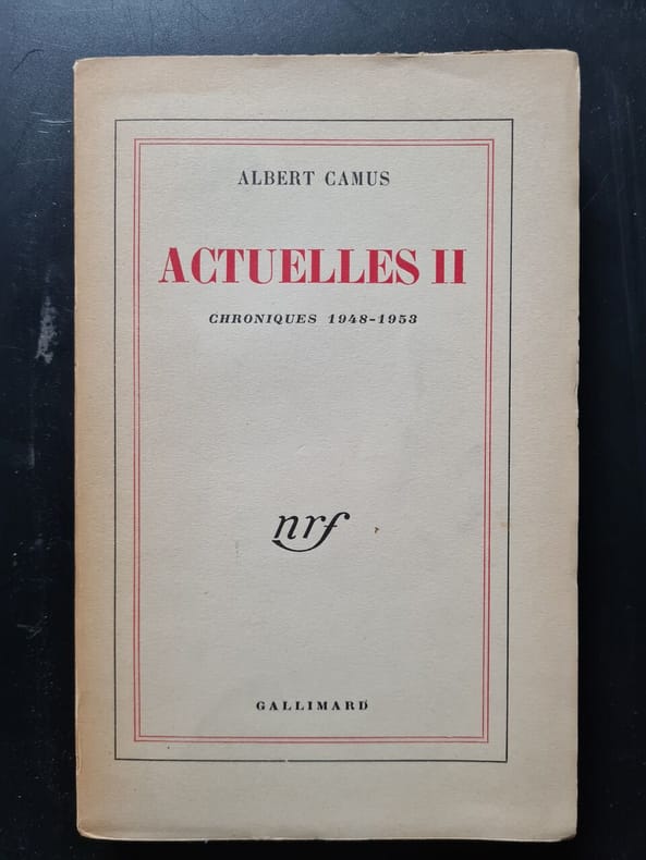 Par Albert Camus.Un des 130 sur vélin pur fil - Actuelle I (N°36) - Actuelle II (N°105) - Actuelle III (N°106).Editions originales. Paris Gallimard nrf - (1950) - (1953) - (1958). 270 p. - 186 p. - 212 p.Ouvrage broché sous couverture rempliée, imprimée en rouge et noir. Non coupé. Pas de rousseur. Très bon état. Format in-12°(19x12).