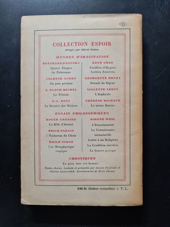 Paris nrf - Gallimard, collection blanche 1960 un volume in-12°, 186 (1) pp., couverture crème imprimée. (couverture légèrement salie). Exemplaire non coupé à partir de la page 49. Bel exemplaire.