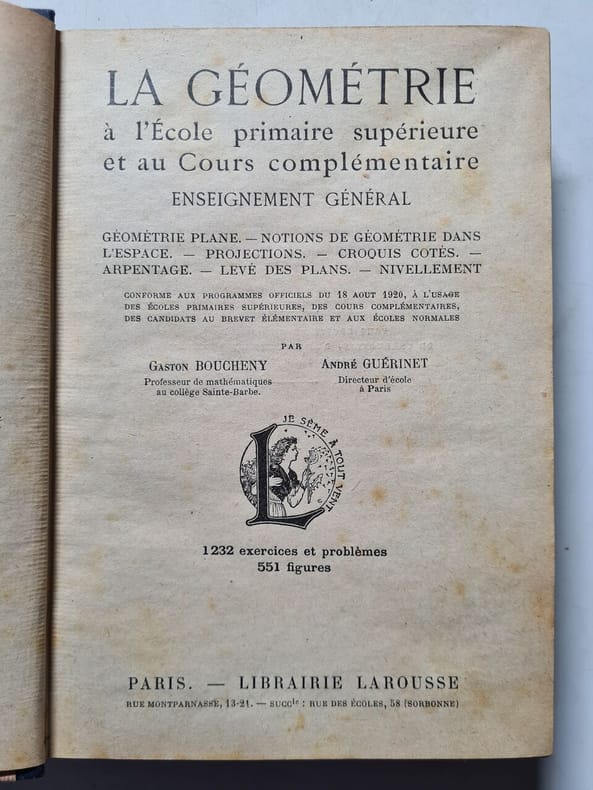 LAROUSSE. 1926. In-12. Cartonné. Bon état, Couv. convenable, Dos satisfaisant, Intérieur frais. 423 pages. nombreuses figures et illustrations en noir et blanc dans le texte. Dos toilé bleu.. . . . Classification Dewey : 372.7-Livre scolaire : mathématiques