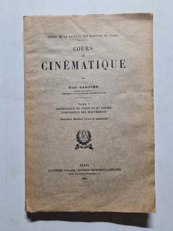 Paris. Gauthier-Villars. 3 volumes in-8. Br. Tome I : 1940. Cinématique du Point et du Solide. Composition des Mouvements. 213 p. Tome II : Roulement et Viration. La Formule de Savary et son Extension à l'Espace. 279 p. Tome III : Géométrie et Cinématique Cayleyennes. 376 p. Qlques figures dans les 3 volumes. BE. Qlques annotations au crayon et en tête du dos. Rousseurs sur la tranche supérieur du Tome I.