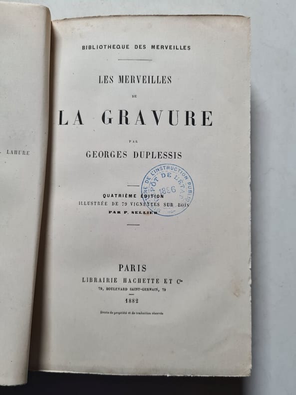 Table; origine de la gravure - la gravure en Italie, Espagne, Pays-bas, Allemagne, Angleterre, en France - procédés - tables des noms des graveurs. Ouvrage illustré de 34 vignettes par P. Sellier Vol relié demi cuir, in8, 180x120, très bel état, 302pp. Paris, Hachette 1869 ref/275