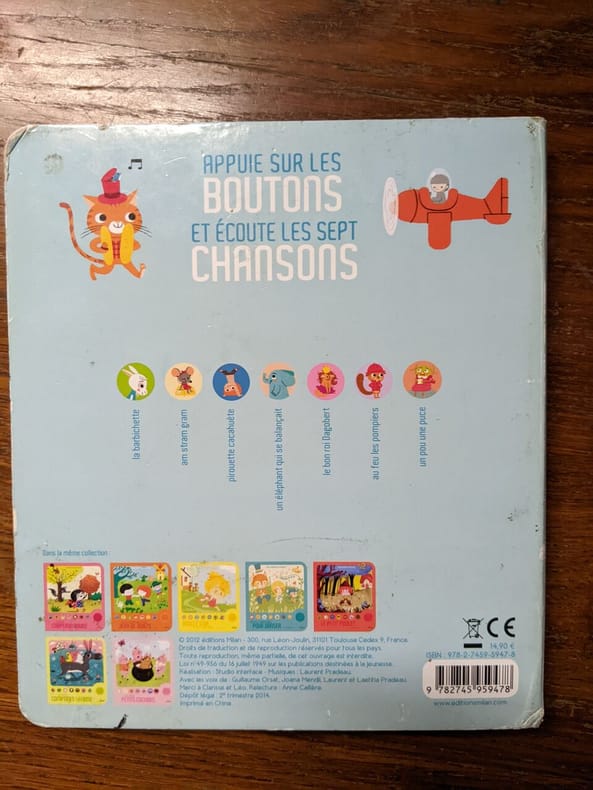 Sommaire: La barbichette, Am Stram Gram, Pirouette cacahuète, Un éléphant qui se balançait, Le bon roi Dagobert, Au feu les pompiers. Classification Dewey : 843.0692-Livres d'enfants