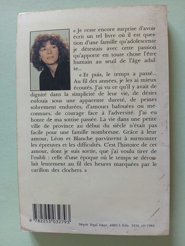 le Grand Livre du mois 1998 256 pages in8. 1998. broché. 256 pages. Je reste encore surprise d'avoir écrit un tel livre où il est question d'une famille qu'adolescente je détestais avec cette passion qu'apporte en toute chose l'être humain au seuil de l'âge adulte... Et puis le temps a passé... Au fil des années je les ai mieux écoutés. J'ai vu ce qu'il y avait de dignité dans la simplicité de leur vie de désirs enfouis sous une apparente dureté de peines sobrement endurées d'amours bafouées ou méconnues de courage face à l'adversité. J'ai eu honte de ma sottise passée. La vie dans une petite ville de province au début du siècle n'était pas facile pour une famille nombreuse. Grâce à leur amour Léon et Blanche parvinrent à surmonter les épreuves et les difficultés. C'est l'histoire de cet amour dont je suis sortie que j'ai voulue tirer de l'oubli: celle d'une époque où le temps se déroulait lentement au fil des heures marquées par le carillon des clochers