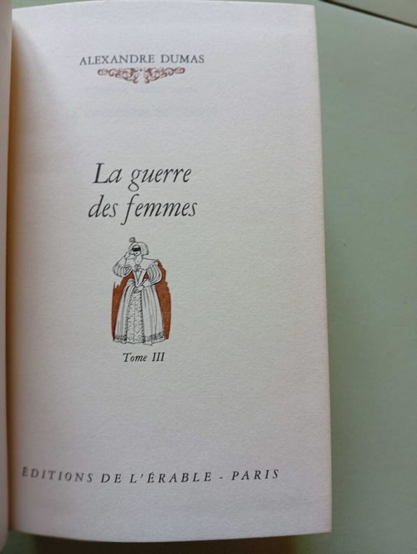 2 volumes in-12 (17 x 11 cm), demi veau fauve à coins (reliure de l’époque), dos à nerfs estampé à froid, pièces de titre et de tomaison en maroquin grenat et vert, double filet à froid en bordure, tranches mouchetées, [2]-354-[2] ; [2]-304-[2] pages (complet). Légers frottements aux mors, quelques feuillets brunis, rousseurs éparses. État correct. Nouvelle édition, parue trois ans après l’originale. La Guerre des femmes est l’un des principaux romans historiques d’Alexandre Dumas (1802-1870), ayant pour fond la célèbre Fronde opposant les Condé au roi Louis XIV. Agréable exemplaire.