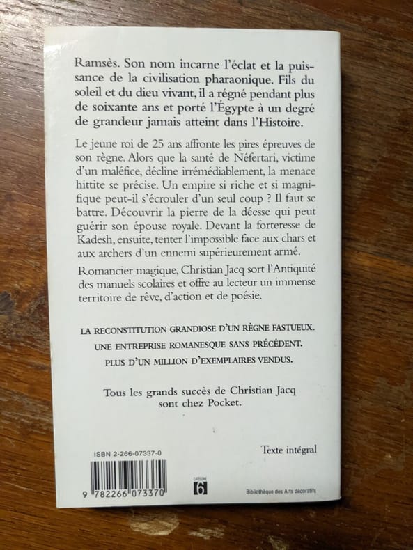 Robert laffont / Romans français 1999 385 pages in8. 1999. broché. 385 pages. Pour sauver l'Egypte Ramsès doit affronter la redoutable armée hittite dont l'armement est supérieur au sien. La grande guerre paraît inévitable. C'est devant Kadesh forteresse imprenable de Syrie du Nord que le choc frontal aura lieu. Comment Ramsès pourrait-il se préparer au combat alors que la santé de sa royale épouse Néfertari victime d'un maléfice décline de manière irrémédiable et que sur le territoire même de l'Egypte un réseau d'espionnage prohittite continue à sévir ? Ramsès ira vers le Sud pour découvrir la pierre de la déesse seul remède susceptible de sauver la reine. Et il ira vers le Nord pour livrer bataille et empêcher la barbarie de détruire la civilisation. Mais son père céleste répondra-t-il à son appel