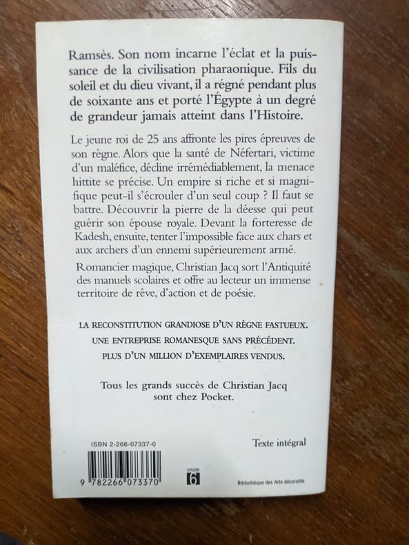 Robert laffont / Romans français 1999 385 pages in8. 1999. broché. 385 pages. Pour sauver l'Egypte Ramsès doit affronter la redoutable armée hittite dont l'armement est supérieur au sien. La grande guerre paraît inévitable. C'est devant Kadesh forteresse imprenable de Syrie du Nord que le choc frontal aura lieu. Comment Ramsès pourrait-il se préparer au combat alors que la santé de sa royale épouse Néfertari victime d'un maléfice décline de manière irrémédiable et que sur le territoire même de l'Egypte un réseau d'espionnage prohittite continue à sévir ? Ramsès ira vers le Sud pour découvrir la pierre de la déesse seul remède susceptible de sauver la reine. Et il ira vers le Nord pour livrer bataille et empêcher la barbarie de détruire la civilisation. Mais son père céleste répondra-t-il à son appel