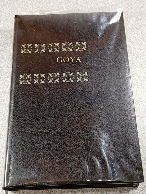 Los Proverbios de Goya. Publicala la Real Academia de Nobles Artes de San Fernando, Madrid, 1891. Album in-folio comprenant un titre et la suite complète de 18 eaux-fortes publiées sous le titre « Los Proverbios » mais dont le titre prévu par Goya était « Disparates » (Extravagances). Brochure verte de l’époque défraichie. 315 mm x 490 mm.