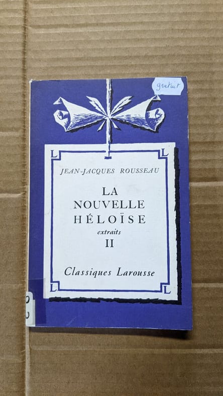 Nouvelle édition, complet 6 tomes, reliés pleine basane époque, frottements, 15x10, bon état intérieur, 334, 270, 282, 328, 328, 226pp. Une gravure en frontispice de Bovinet. Paris, chez Pigoreau, an VII ( 1798) "La Nouvelle Héloïse" est un roman épistolaire écrit par Jean-Jacques Rousseau et publié en 1761. L'ouvrage est considéré comme l'un des chefs-d'œuvre du mouvement littéraire du romantisme. Le roman raconte l'histoire d'amour tragique entre Julie d'Étange, une jeune femme noble, et Saint-Preux, un précepteur. Le récit est présenté sous forme de lettres échangées entre les personnages, ce qui permet à Rousseau d'explorer leurs pensées intimes et leurs émotions. "La Nouvelle Héloïse" aborde des thèmes tels que l'amour passionné, les conventions sociales, la nature et la moralité. Il a eu un impact considérable sur la littérature européenne de l'époque et a contribué à populariser le genre épistolaire. L'ouvrage est divisé en plusieurs parties, comprenant des lettres de différents personnages, des dialogues et des réflexions philosophiques. Il a été très influent dans le développement du mouvement romantique et a suscité un engouement pour la sensibilité et l'expression des émotions dans la littérature. ref/25/8