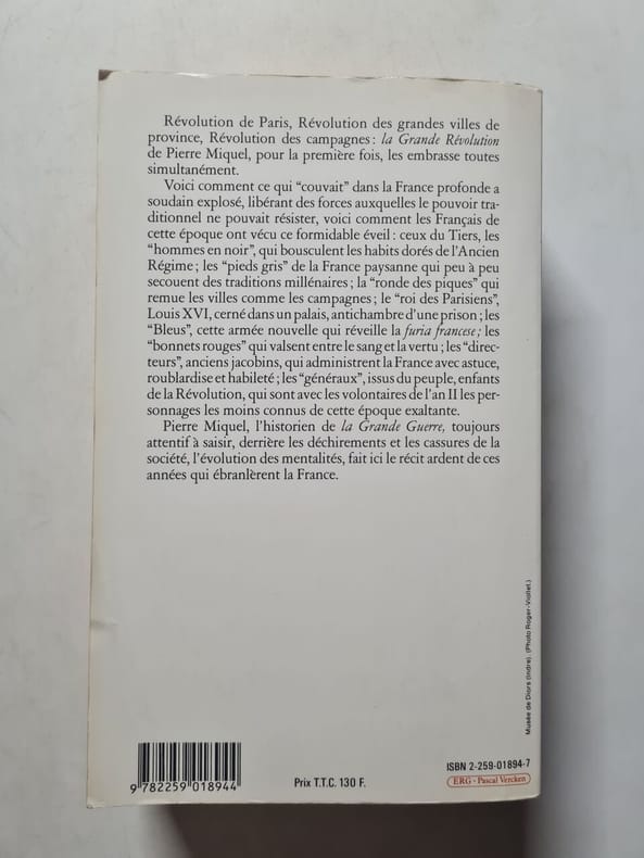 "Révolution de Paris, Révolution des grandes villes de province, Révolution des campagnes : “La Grande Révolution” de Pierre Miquel, pour la première fois, les embrasse toutes simultanément. Voici comment ce qui “couvait” dans la France profonde a soudain explosé, libérant des forces auxquelles le pouvoir traditionnel ne pouvait résister, voici comment les Français de cette époque ont vécu ce formidable éveil : ceux du Tiers, les “hommes en noir”, qui bousculent les habits dorés de l'Ancien Régime ; les “pieds gris” de la France paysanne qui peu à peu secouent des traditions millénaires ; la “ronde des piques” qui remue les villes comme les campagnes ; le “roi des Parisiens”, Louis XVI, cerné dans un palais, antichambre d'une prison ; les “Bleus”, cette armée nouvelle qui réveille la “furia francese” ; les “bonnets rouges” qui valsent entre le sang et la vertu ; les “directeurs”, anciens jacobins, qui administrent la France avec astuce, roublardise et habileté ; les “généraux”, issus du peuple, enfants de la Révolution, qui sont avec les volontaires de l'an II les personnages les moins connus de cette époque exaltante."
