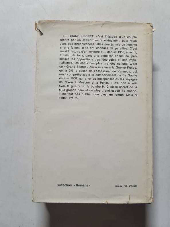 Presses de la Cité 1973, in-8 cartonnage de l'éditeur sous jaquette illustrée, 346 p. (très bon exemplaire) Première édition. Un grand secret explique la fin de la Guerre Froide, l'assassinat de Kennedy ou l'étrange comportement de de Gaulle en mai 68... Encore un roman surprenant de l'auteur de "La Nuit des Temps".