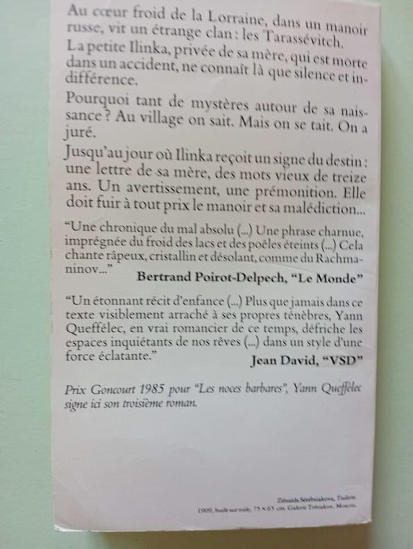 Edition originale. Exemplaire enrichi d'un envoi autographe signé de Yann Queffélec au faux-titre. ''Quelle fatalité poursuit de génération en génération, jusqu'à nos jours, cette famille d'exilés russes réfugiés en Lorraine? Dans un manoir en bois de la forêt vosgienne, réplique d'une demeure ancestrale incendiée par les moujiks à la Révolution, vit la petite Ilinka surnommée Tita. Rescapée à six mois d'un accident d'auto où sa mère a péri brûlée, marquée par une cicatrice au visage, Tita refuse son rôle de personnage tragique et fatal annoncé depuis toujours par les tarots et cherche la vérité sur sa naissance. Pour rompre l'envoûtement d'une famille autodestructrice et repliée sur ses nostalgies, il lui faut fuir la fascination du manoir, l'autorité cruelle de la grand-mère Zinnaïde, la séduction déchirante de l'oncle Lev, les violences d'un père hanté par Carmilla, sa femme disparue. Tita vivra des amours douloureuses et compliquées. Le mariage, un enfant seraient peut-être son salut. Mais la malédiction qui la poursuit n'est-elle pas inconsciemment sa raison de vivre? Plats à l'éclat très légèrement altéré. Du reste, très belle condition.