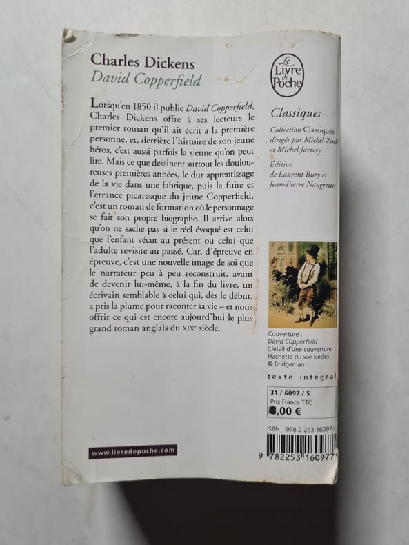 3 volumes in-8 (21,5 cm x 12,5 cm), demi-chagrin bleu (reliure de l’époque), dos à nerfs orné de motifs dorés. xx-394 ; 470 ; 483-[1] pages (complet). Frottements à la reliure, petites déchirures marginales à certains feuillets, mouillures, rousseurs. État très correct tout de même. Première édition française, traduite de l'anglais par Amédée Pichot (malgré la mention de "3ème édition plus complète que les précédentes" figurant sur le titre se référant à la publication préalable de fragments en revue). David Copperfield ou L'Histoire, les aventures et l'expérience personnelles de David Copperfield le jeune (en anglais : The Personal History, Adventures, Experience and Observation of David Copperfield the Younger), est le huitième roman de Charles Dickens et le premier de cet auteur à présenter un narrateur à la première personne. Il a été publié en vingt numéros et dix-neuf parutions, par Bradbury and Evans, entre 1849 et 1850, avec des illustrations de Hablot Knight Browne, dit Phiz. Beaucoup considèrent ce roman comme le chef-d'œuvre de Dickens. Situé au milieu de la carrière de Dickens, il représente un tournant dans son œuvre, le point de séparation entre les romans de la jeunesse et ceux de la maturité tout en se révélant être l'ouvrage le plus autobiographique de l'auteur. Agréable exemplaire.