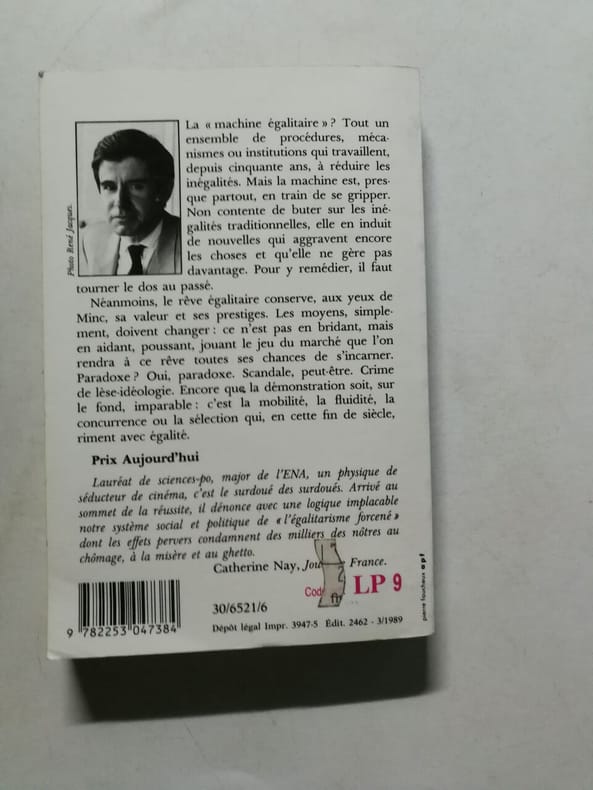 Le livre de poche 1989 316 pages 11 0cm x 16 6cm x 1 5cm. 1989. broché. 316 pages. La " machine égalitaire " Tout un ensemble de procédures mécanismes ou institutions qui travaillent depuis cinquante ans à réduire les inégalités. Mais la machine est presque partout en train de se gripper. Non contente de buter sur les inégalités traditionnelles elle en induit de nouvelles qui aggravent encore les choses et qu'elle ne gère pas d'avantage. Pour y remédier il faut tourner le dos au passé. Néanmoins le père égalitaire conserve aux yeux de Minc sa valeur et ses prestiges. Les moyens simplement doivent changer : ce n'est pas en bridant mais en aidant poussant jouant le jeu du marché que l'on rendra à ce rêve toutes ses chances de s'incarner. Paradoxe ? Oui paradoxe. Scandale peut-être. Crime de lèse-idéologie. Encore que la démonstration soit sur le fond imparable : c'est la mobilité la fluidité la concurrence ou la sélection qui en cette fin de siècle riment avec égalité