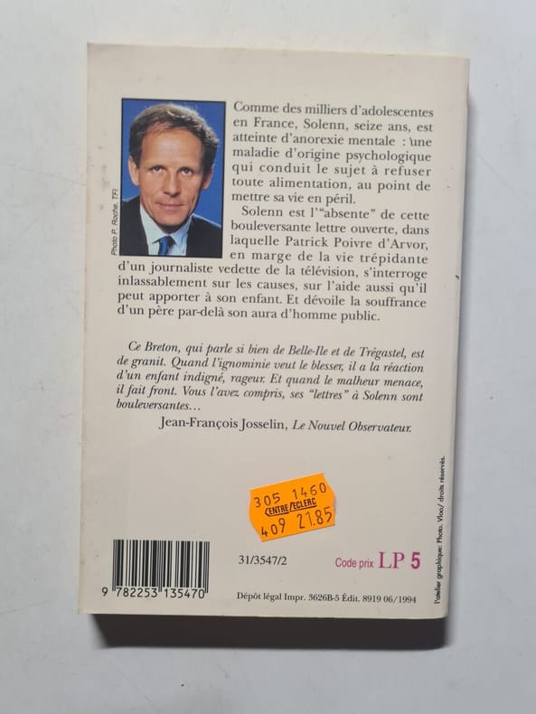 Albin Michel 1993 156 pages in8. 1993. Broché. 156 pages. Comme des milliers d'adolescentes en France Solenn seize ans est atteinte d'anorexie mentale : une maladie d'origine psychologique qui conduit le sujet à refuser toute alimentation au point de mettre sa vie en péril. Solenn est l'"absente" de cette bouleversante lettre ouverte dans laquelle Patrick Poivre d'Arvoir en marge de la vie trépidante d'un journaliste vedette de la télévision s'interroge inlassablement sur les causes sur l'aide aussi qu'il peut apporter à son enfant. Et dévoile la souffrance d'un père par-delà son aura d'homme public