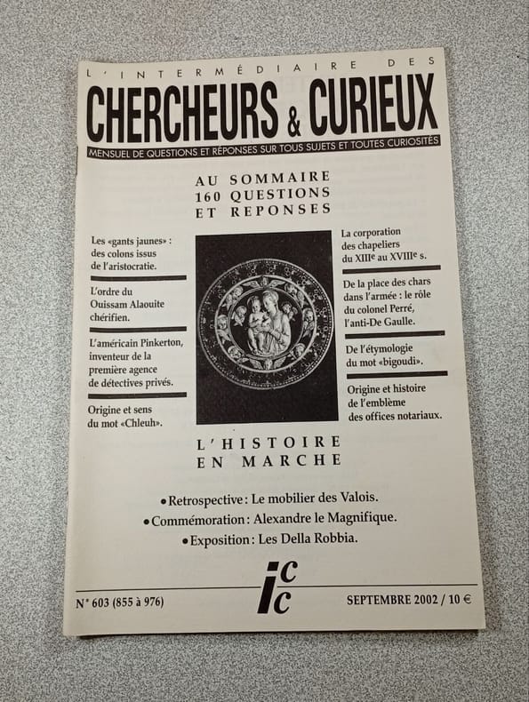 Sommaire : questions. — Le mot laquais. — Dégouginé.—Lifrelofres. — De qui la double définition i — Sur un mot attribué au prince de Conué. — Sur le figuier de M. Dybowski.—A quèl genre appartient le nom des villes? — La cordelière d’Anne de Bretagne. — Quelle est la localité parisienne où fut battu l’empereur Gratien? — Sur le zouave Daurière, qui prit, pendant la campagne d’Italie, le drapeau du 9e autrichien.—Le marquis de Dangeau et la fondation de l’Ecole militaire. — Le séjour de la Vierge Marié* à Epnesel — L’uniforme des régiments suistfes sous ,1a Restauration. — Les bègues célèbres. — Le marteau des Commissaires-Priseurs. — Origine des glacières. — Une ambassade au Maroc auXVIe siècle. — Vie de Christophe Colomb écrite par Fernand, son fils. — Le donjon de Vincennes depuis i85i. — Mémoires du maréchal duc de Bellune. — L’Imprimerie Nationale a-t-elle un caractère spécial dont il est défendu aux autres imprimeurs de se servir? — Huaut,émailleur du XVIIe siècle. — Qu’est devenue la Thomyris de Ru-bens achetée par le comte de Darnley en 1798 à la vente du duc d’Orléans ? — Les mémoires et les écrits laissés par les comédiens célèbres. — Recherche d’un contrat de mariage à Rouen. — Les sources actuelles de Tétat civil à Paris. — Deux anonymes à découvrir. — Les armes de Strasbourg.réponses. — Le vase nocturne. — Les chiens de guerre dressés par les Huguenots en i562. — Quel est l’inventeur des lunettes?—Le comte Guerri de JVJaubreuil et. ses mémpires. — Quel est le livre imprimé dans le format le plus exigu ? — Le livre d’or des répétiteurs. — Quels sont les écrivains qui ont adopté la devise : Vitam im-pendere vero ? — Got, nom patronymique.—Nombres appropriés aux hommes célèbres. — Les Médicis. — Louis XVIII fratricide. — Le chat et la science du blason.—Les vers tragiques ridicules — Un dicton sur les Lorrains. — Les fVîntes magiques. — Liste des tombe* des soldats français à l’étranger. — Les hommes célèbres qui ont eu le plus d’enfants. — La locution « quoique ça ». — Le vandalisme officiel. — M. de Montsaulnin, gouverneur de Charleroi, sous Louis XIV. — Sur un expert de la Restauration, Pierre Roux (du Cantal). — Le Tasse ou Guarini? — Définitions originales de la poésie. — Existe-t-il en Angleterre une statue élevée à un Français célèbre ? — Le Chant du Départ. — Madame Allan-Despréaux et madame Dorval.—Le premier thermomètre à mercure. — Valet de trèfle pharmacien. — Pays d'a-mor, d’armor, d’arvor. — L’ordre du Moment. — Une lettre de la Vierge Marie.— Tristao de Cunlia et Tes Suisses. — Un manuscrit des poésies d’Ossian. — Le R. P. Vincent Partevaux, recteur du col-• lège de la Compagnie de Jésus, à Rennes.trouvailles et CURIOSITÉS. — La suppression des étrennes, décrétée par l’Aïsemblée Constituante.nouvelles. — La Table générale de VIntermédiaire. — Mouvement des Bibliothèques, des Archives, Collections et Musées.—Paris. — Une fausse nouvelle à sensation. La prétendue donation à l’Académie des Sciences et au musée de Cluny de l’aspic de Vaucanson. — La note de M. Vap-querie sur le prétendu manuscrit de Victor Hugo, le Journal de VExil, découvert récemment en Angleterre. — Le Musée des sourds-muets. — Départements. — Carcassonne.— La donation, à la Bibliothèque de la Ville, des papiers de la famille Ché-nier. — Chantilly. — Le catalogue des collections du duc d’Aumale. — La Rochelle. — Publication de l’Inventaire des Archives de la Charente-Inférieure.— Etranger. — Allemagne. — Dresde. — Publication d’un Album des reliures de la Bibliothèque royale publique. — Weimar. — Découverte de poésies inédites de Gœthe et de Schiller. — Angleterre. — Edimbourg.—Le truquage. Arrestation d’un fabricant de faux autographes. — Londres. — La donation de M. Tate pour un Musée du Luxembourg anglais. — Belgique. — Anvers. — Le truquage. Condamnation d’un fabricant de faux tableaux. — Suisse. — Genève. — Le truquage. Les fausses monnaies du Salève. — Ventes publiques. — Paris. — Départements. — Etranger. Classification Dewey : 1-Le savoir