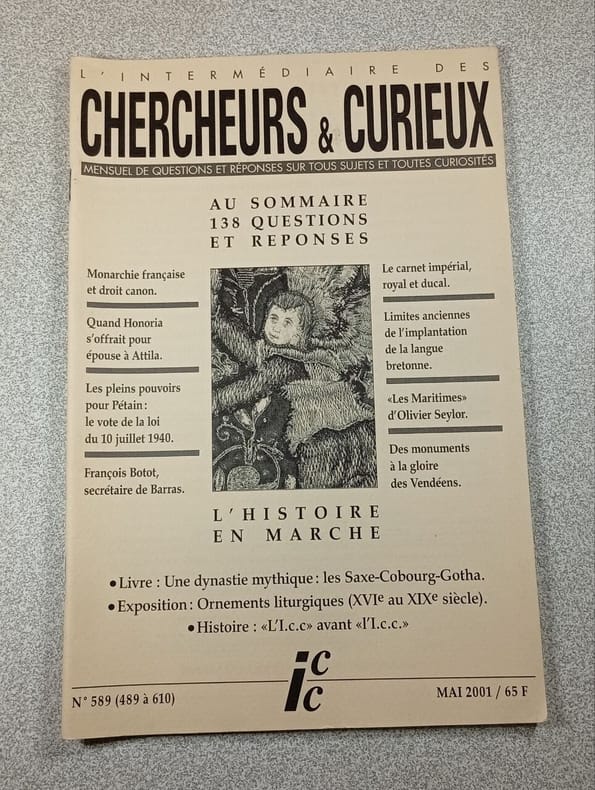 Mensuel de questions et réponses historiques, littéraires, artistiques et sur toutes autres curiosités. Sommaire : QUESTIONS 587 : Signatures des souverains français. — 589 : Joseph Pelpel. — 589 : Guétides. —589: Famille Neveu-Bletterie. — 589 : Divisions administratives d'Alsace-Lorraine. —590: Un comte de Courtenay, fils de Georges III d'Angleterre ? — 590 : Tarabusté, jeu. — 590 : Condy Raguet économiste américain. — 590 : Lits germaniques. — 591 : Hippolyte et Edouard Hostein. — 591 : Jules Soury, athée catholique. — 591 : Armoiries — mer, tour et étoile; senestrochère et étoile — à identifier. — 591 : Géza Szapàry à Paris. — 591 : Famille de Ville de Quincy. — 592 : Male-geah, décoration à identifier. — 592 : Descendance Brivazac-La Roque-Budos. — 592 : « Le roi est empereur en son royaume ». — 592 : P.C.V. de Suhard. — 592 : Plagiats et plagiaires. — 592 : Famille Platon. — 593 : Officier de la garde nationale à Paris. — 593 : Abbé Alexandre Charvoz. — 593 : Les canons de Fontenoy du maréchal de Saxe. — 594 : Moret. — 594 : « Pomponne », verre. — 594 : Los Rios, comtes de Fernand-Nunez. — 594 : Plurilinguisme de Bacon. — 595 : Famille de Naives. — 595 : Députés des colonies françaises. — 595 : Salon(n)e. — 595 : Légalité des mariages des ci-devant prêtres à la Révolution. — 596 : Alençon. — 596 : Marchands de légumes espagnols. — 596 : Famille de Viellevigne. — 596 : Chapeaux Péruviens. —597: Verdier, en Charente. — 597 : Révolte des Noirs aux Antilles. — 597 : Guillaume de Trin. — 598 : « Galopin » dans l'armée autrichienne. — 598 : Cardailhac-La Troyne.REPONSES 598: A propos de l'Intermédiaire des chercheurs et curieux. — 601 : L'énigme Louis XVII. — 607 : Les sirènes. — 607 : Famille Murât. — 607 : Les origines de Jeanne d'Arc.—608 : A.n.f. — 609 : Famille André de la Ronade. — 609 : Pierre Rol(l)and, ancêtre de la reine Elisabeth II. — 610 : Ordres de chevalerie fantaisistes. — 610 : Grolée-Virville. — 611 : Société des amis de ... — 611 : Les pseudonymes. — 611 : Famille La Mazelière de Réaup-Trenquelléon. — 612 : Bâtards des Stuarts. — 613 : Appellation des départements français. — 613 : Raspoutine. — 613 : Les grandes mystifications. — 615 : Noms courts, noms longs. — 615 : Longueville. — 616 : Merle des Isles. — 616 : Strohl. — 616 : Sophie Arnould. — 616 : Ordre de Cincin-natus. — 617 : Les plus belles « coquilles ». Classification Dewey : 1-Le savoir