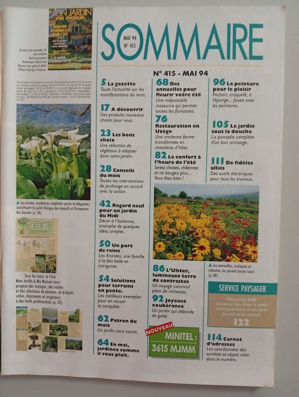 Sommaire : Arbustes : ils fleuriront votre été - Balade en Pays Basque - Au Japon, le respect du végétal - Couleurs en Normandie - Tous les cousins des Iris - Cuisines : l'utile et l'agréable - Réussir son entrée - A la gloire des glycines et des pivoines - Etranges et belles solanacées - Le potager en fleurs - Coup de fraîcheur dans la salle de bains - Moisson d'annuelles pour l'été - Iris et arums : enrichissez votre collection - Une création au pays des lavandes - Le jardin se joue des pentes - Peintures : inventez votre décor - 200 jardins à visiter - Les atouts des feuillages panachés - Marguerites sur tous les tons - Petits jardins modèles - Des aménagements pour profiter de l'été - Tonnelles et pergolas : des voûtes de fleurs - Escapade en forêt - Les délices d'un jardin de condimentaires - Les favorites des terres arides - Comment aménager les combles - 40 plantes faciles à réussir - Jardinage d'automne : l'heure des projets - Promenade en Uzège - D'autres choix pour la haie - Idées sur mesure pour habiller vos fenêtres - Plantations à effets graphiques - Bassins : un rêve accessible - Découvrez les fleurs de la passion - Jardins de demain - Vérandas et coins-repos vous invitent à la détente - Tuteurage et palissage : guidez bien vos plantes - Des écorces étonnantes - Giverny : plan-patron d'une bordure - Les orchidées de pleines terre - Dépaysez-vous : faites une jungle.. Classification Dewey : 712-Art du paysage