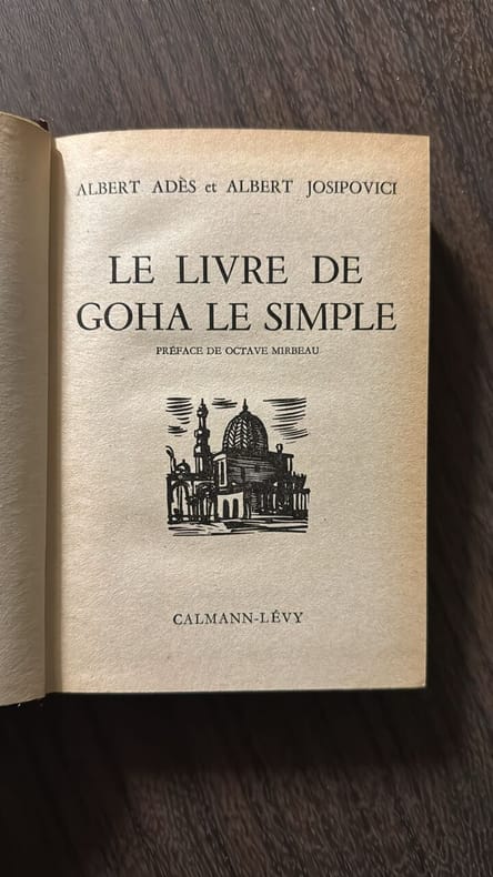 Paris, Calmann Lévy, Éditeurs, s.d. (vers 1945) ; in-8, 322 pp., broché. Préface d'Octave Mirbeau. Livre sur la vie quotidienne des Egyptiens. Les auteurs seront présentés comme des écrivains égyptiens de langue française. "Le Livre de Goha le Simple", présenté pour le Prix Goncourt, en 1919, obtient la deuxième place derrière "À l’ombre des jeunes filles en fleurs" de Marcel Proust. Le livre sera porté à l'écran sous le titre "Goha", par Jacques Baratier, avec Omar Sharif et Claudia Cardinale. Bon état.