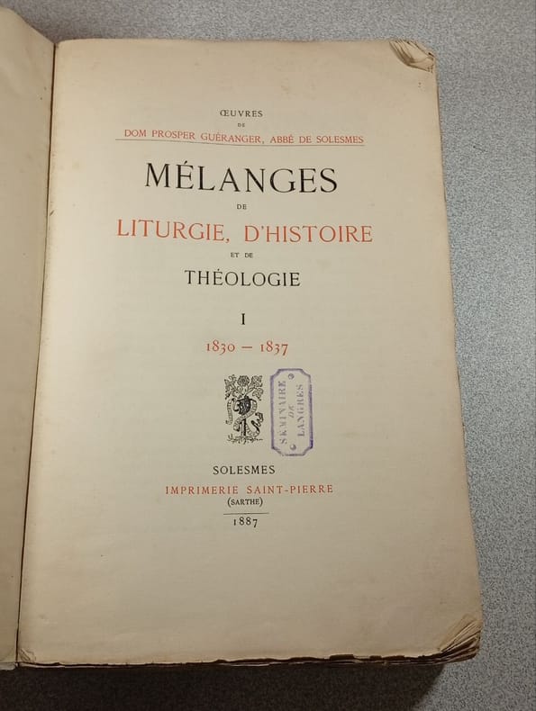 Solesmes, Impr. Saint-Pierre 1887 xv + 612pp., dans la série "Oeuvres de dom Prosper Guéranger abbé de Solesmes" tome I (le tout paru!), titre en rouge et noir, 25cm., reliure cart. solide, texte frais (sauf peu de rousseurs occasionnelles), bon état, [Contient e.a.: De l'élection et de la nomination des évêques (pp.137-382) & Essai historique sur l'abbaye de Solesmes.. (pp.383-554)], poids: 1kg., R116537