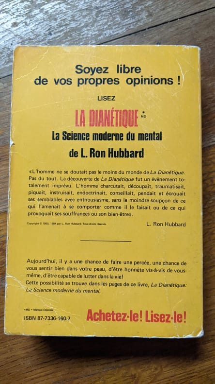 Sommaire : le champ de la dianétique - le clair - le but de l'homme - les quatre dynamiques - le mental réactif - les démons - les maladies psychosomatiques - le key in de l'engramme - contagion de l'aberration etc... Classification Dewey : 500-SCIENCES DE LA NATURE ET MATHEMATIQUES