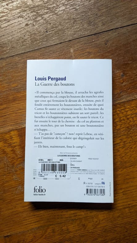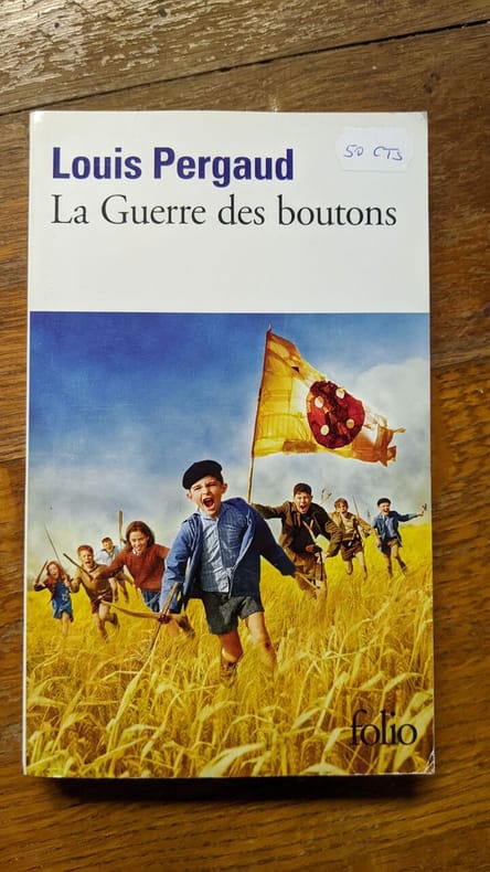 La Guerre des boutons est un roman français écrit par Louis Pergaud, écrivain franc-comtois, et publié en 1912. Il décrit la « guerre » que se livrent les bandes d'enfants de deux villages rivaux, Longeverne et Velrans, dans la campagne franc-comtoise de la fin du XIXe siècle. L'auteur s'est inspiré de la vie dans le village de Landresse, dans le département du Doubs, où il a enseigné deux ans. Le titre vient du butin de cette guerre, constitué en majorité par les boutons dont les vaincus sont dépouillés par les vainqueurs. Le récit, pour la plus grande partie, raconte l'histoire du point de vue des enfants de Longeverne. Louis Pergaud remporta le prix Goncourt avec De Goupil à Margot, Histoire de bêtes en 1910, mais c'est avec La Guerre des boutons qu'il rencontra le succès. Il fut tué près de Marchéville (dans les environs de Verdun) le 4 avril 1915. Insolation au dos et légères usures et salissures à l'étui.