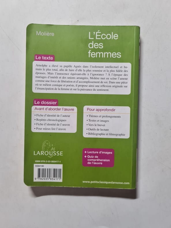 Larousse Sans date. L'École des femmes est une comédie de Molière qui critique les relations conjugales et l'éducation des femmes au XVIIe siècle à travers l'histoire d'Arnolphe un homme qui tente d'épouser sa pupille Agnès après l'avoir élevée dans l'ignorance