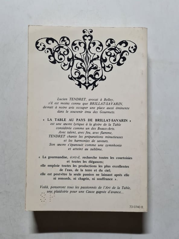 Lucien Tendret avocat à Belley et neveu de Brillat-Savarin, fit paraître en 1892 cet amusant ouvrage, véritable livre de "cuisine-fiction" qui aurait inspiré Marcel Rouff pour son Dodin-Bouffant. Regorgeant d'anecdotes, ce pittoresque recueil fait défiler sous les yeux du lecteur aux papilles enthousiasmées toutes les richesses gastronomiques du Bugey natal de Tendret : chapons, dindons, écrevisses, lavarets, morilles, légumes à la saveur incomparable... Il consigne également des recettes fameuses : Le Poulet Célestine, L'Oreiller de la Belle-Aurore, ou encore cet étonnant Chapeau de M. Gabriel Cortois de Quincey, toutes préparations faisant appel à force truffes, volailles et autres gibiers. Voir le sommaire sur photos jointes.