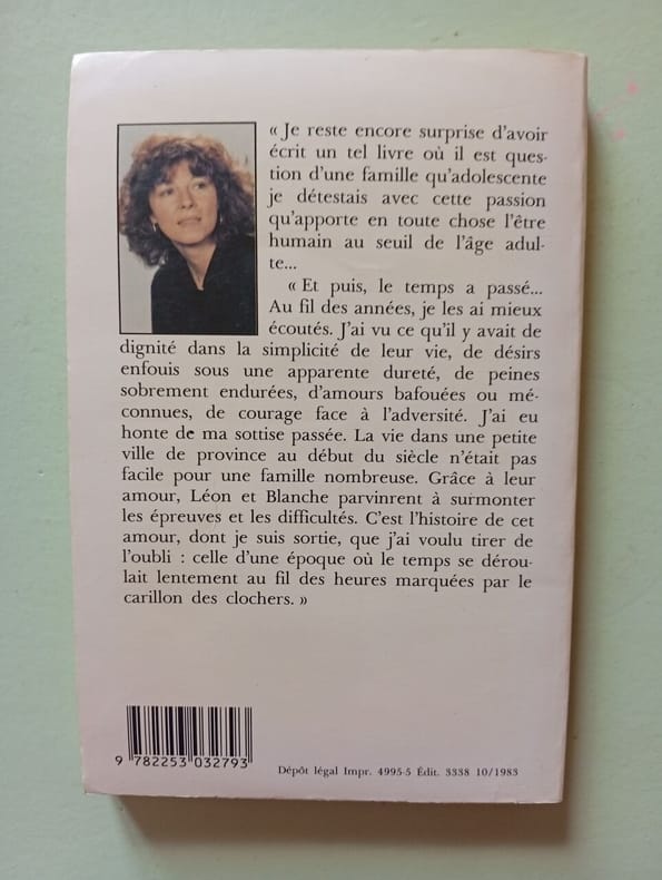 le Grand Livre du mois 1998 256 pages in8. 1998. broché. 256 pages. Je reste encore surprise d'avoir écrit un tel livre où il est question d'une famille qu'adolescente je détestais avec cette passion qu'apporte en toute chose l'être humain au seuil de l'âge adulte... Et puis le temps a passé... Au fil des années je les ai mieux écoutés. J'ai vu ce qu'il y avait de dignité dans la simplicité de leur vie de désirs enfouis sous une apparente dureté de peines sobrement endurées d'amours bafouées ou méconnues de courage face à l'adversité. J'ai eu honte de ma sottise passée. La vie dans une petite ville de province au début du siècle n'était pas facile pour une famille nombreuse. Grâce à leur amour Léon et Blanche parvinrent à surmonter les épreuves et les difficultés. C'est l'histoire de cet amour dont je suis sortie que j'ai voulue tirer de l'oubli: celle d'une époque où le temps se déroulait lentement au fil des heures marquées par le carillon des clochers