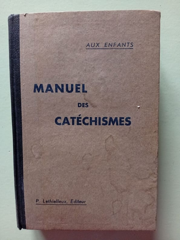 F. Rocher. 1875. In-16. Relié plein cuir. Etat d'usage, Couv. légèrement passée, Dos à nerfs, Intérieur acceptable. 468 pages. Gravures en noir et blanc en frontispice et en page de titre. Titre doré sur le dos. Initiales en lettres métalliques sur le 1er plat (C.E.). Date en lettres dorées en page de garde (13 mai 1875). Tranche dorée. Annotations d'époque à la plume en page de garde. Prières en latin et en français en vis-à-vis.. . . . Classification Dewey : 268-Catéchisme