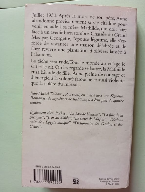 Pocket / Terroir 2000 295 pages poche. 2000. broché. 295 pages. Juillet 1930. Après la mort de son père Anne abandonne provisoirement sa vie citadine pour venir en aide à sa mère Mathilde qui doit faire face à un avenir bien sombre. Chassée du Grand Mas par Georgette l'épouse légitime elle s'efforce de restaurer une maison délabrée et de faire revivre une plantation d'oliviers laissée à l'abandon. La tâche sera rude. Tout le monde au village le sait et le dit. On les regarde se battre la Mathilde et sa bâtarde de fille. Anne pleine de courage et d'énergie à la volonté farouche et aussi violente que la colère du mistral