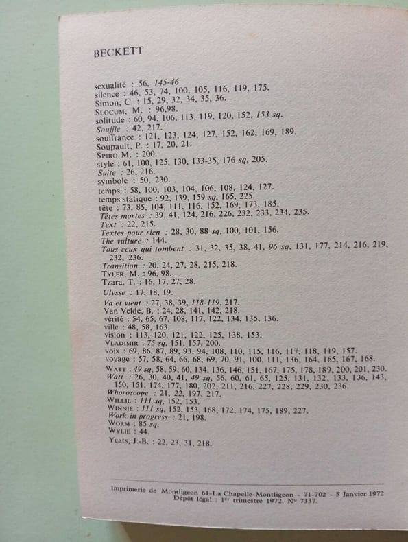 100 PAGES FORMAT 21,5 CM X 27 CM-EN COUVERTURE BECKETT PAR MORETTI-DOSSIER BECKETT SUR 31 PAGES, SAMUEL BECKETT PAR JEAN ROUDAUT, UN VIVANT, PAR CHARLES JULIET, PERSONNE DE NULLE PART, PAR RICHARD ELLMANN, LES MOTS DES AUTRES, PAR EVELYNE PIELLER, LA VOIX A L'OEUVRE, PAR JEAN ROUDAUT, TOUT UN THEATRE, PAR ALFRED SIMON, LA PREMIERE DE GODOT, PROPOS RECUEILLIS PAR EVELYNE PIEILLER, BLIN L'ADMIRABLE, PAR PAULE THEVENIN, SILENCE, IL TOURNE, PAR FRANCOIS JOST, SUR PROUST, PAR JEAN-PAUL MANGANARO, BIBLIOGRAPHIE-LA SYMPHONIE POUND, 3P PAR JEAN-MICHEL RABATE, POUND EN CONDENSE, 2P PAR PHILIPPE MIKRIAMMOS, L'EPOPEE POUNDIENNE, PAR BERNARD DELVAILLE-CRITIQUE POUR "UNE VIE DE CHAT" DE YVES NAVARRE, PHOTO-LE ROI DE PIQUE, HENRI POURRAT, 2P PAR JEAN-LOUIS HUE, PHOTO-CRITIQUE POUR "LA PRINCESSE BIBESCO" DE GHISLAIN DE DIESBACH, PHOTO-ENTRETIEN, NOUVELLE HISTOIRE DE LA GRECE ANCIENNE, 6P, 3 PHOTOS-LA BELLE ECRITURE, 1P PAR ALAIN GARRIC, HASSAN MASSOUDY, CALLIGRAPHIE, PHOTO
