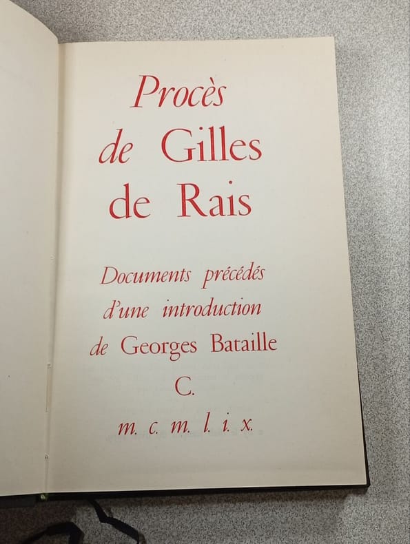 Le club français du livre, 1959. Coll. " Essais ". In-8 reliure pleine toile éditeur décorée. Maquette de J. Daniel. Le texte des deux procès de Gilles de Rais a été établi sur les minutes et annoté par G. Bataille. Le plumitif latin du procès d'église a été traduit par Pierre Klossowski. Index des noms et des lieux. Bibliographie. Complet de la carte en dépliant. Ex. num.