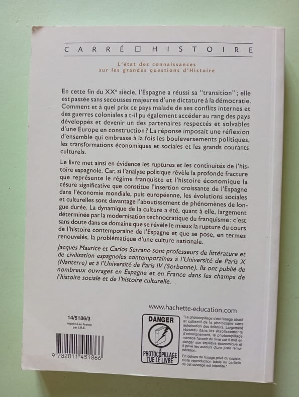 L'Espagne du XXe siècle présente deux visages. Celui d'une modernisation économique, sociale et politique manquée jusqu'après la Deuxième Guerre mondiale, qui a débouché sur la guerre civile et le franquisme. Ensuite, l'autre visage que l'Espagne offre d'elle-même depuis 1960, exactement inverse. — "Un ouvrage très bien conçu et admirablement réalisé." (David Wingeate Pike, Guerres mondiales et conflits contemporains, 1988)
