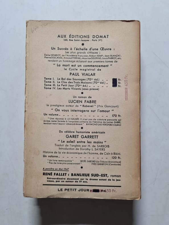 Domat. 1947. In-12. Broché. Etat d'usage, Plats abîmés, Dos plié, Intérieur frais. 446 pages.. . . . Classification Dewey : 840-Littératures des langues romanes. Littérature française